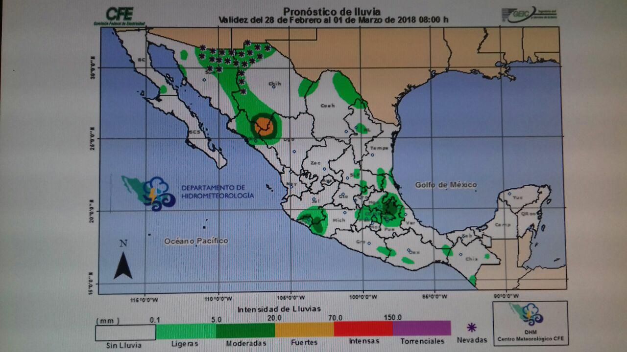Se esperan vientos fuertes en todo el norte del país.Lluvias fuertes en Sínaloa,Chihuahua y Durango. Nevadas en Sonora y Chihuahua.